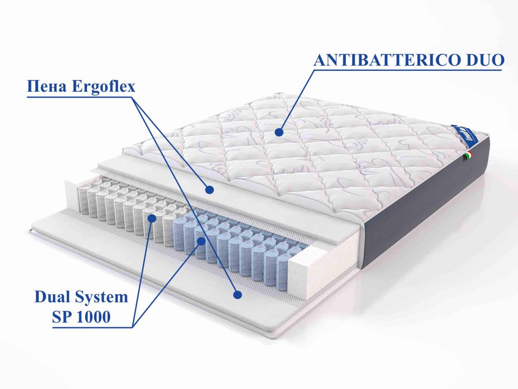 Чехол: Система комфорта ANTIBATTERICO DUO comfort - верхний комфортный слой изготовлен с применением гиппоаллергенных материалов,соединенных между собой по технологии глубокой стежки