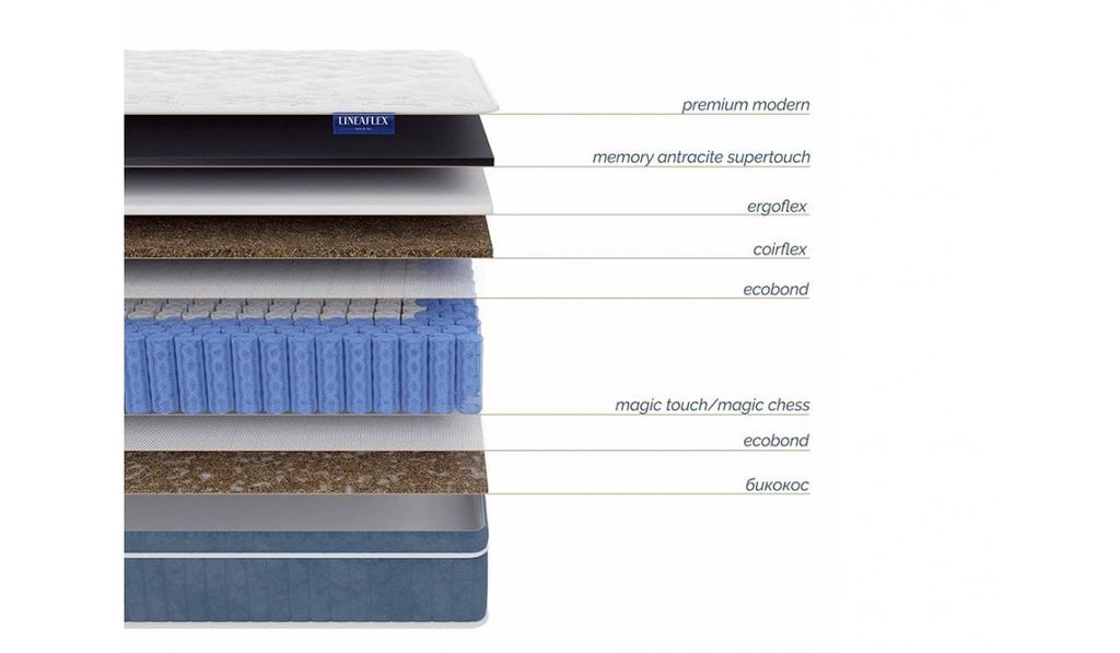 Наполнение: Пена Memory Antracite Supertouch 2 см, пена Ergoflex 3 см, кокосовая койра 2 см.