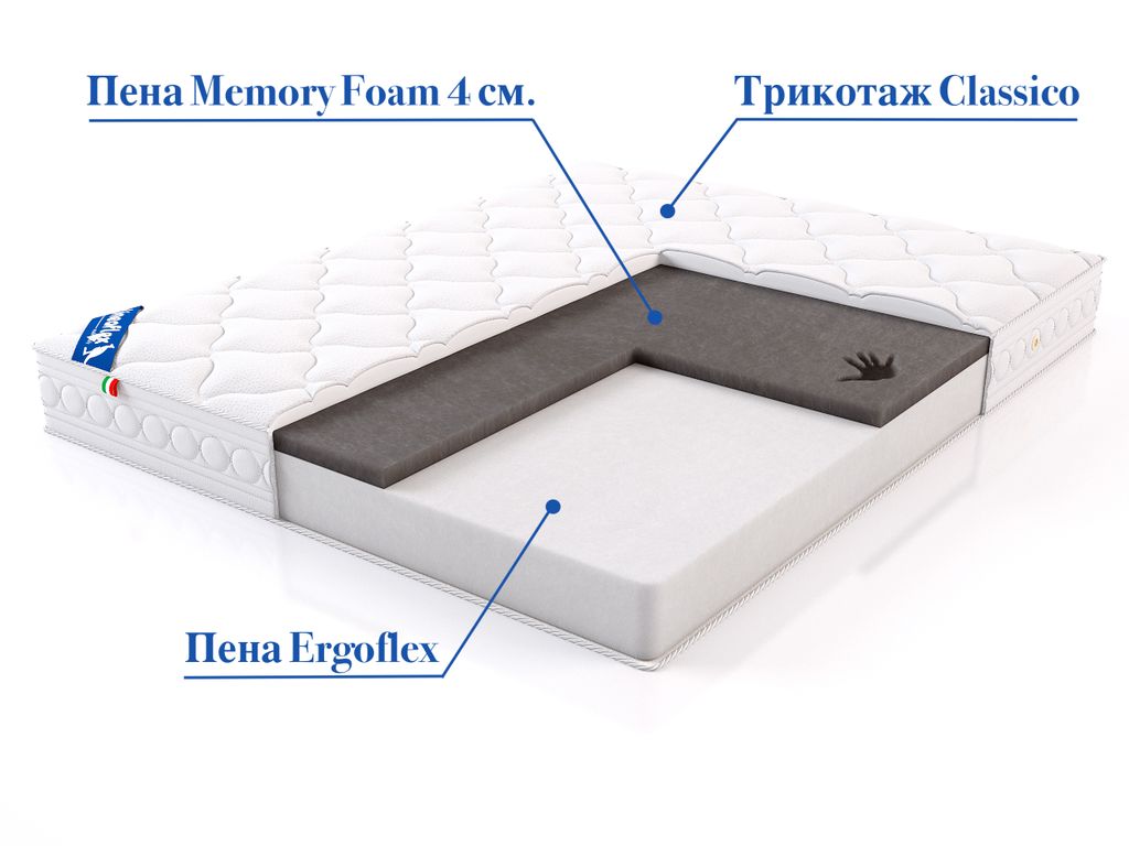 Состав: В основе лежит монолит пены Ergoflex (пенополиуретан) 14 см. Верхний слой - пена Mirror Form 4 см.